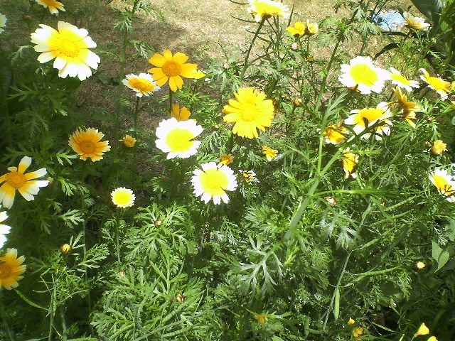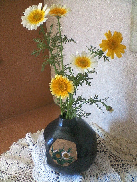 4月27日。昨年10月頃種まきして成長した春菊を1月、2月と収穫しておいしく頂きました。...がしかし、3月に入るとこの春菊が塔立ちし始めてしまい、食べてみると茎が硬くて食べられない状態となってしまいました。仕方なく1プランター分を種取り用として庭の片隅に植えて放置してたら今月中旬くらいから花が咲き始めたんです!意外に綺麗な花なのでビックリです!単色だけじゃなくて白と黄色、白とクリーム色や黄色のグラデーションの花がいろいろと混ざり合ってて「花」として十分楽しめます!数本、茎をハサミで切って玄関に飾ってみました。なかなかイイ感じでしょ?(笑)